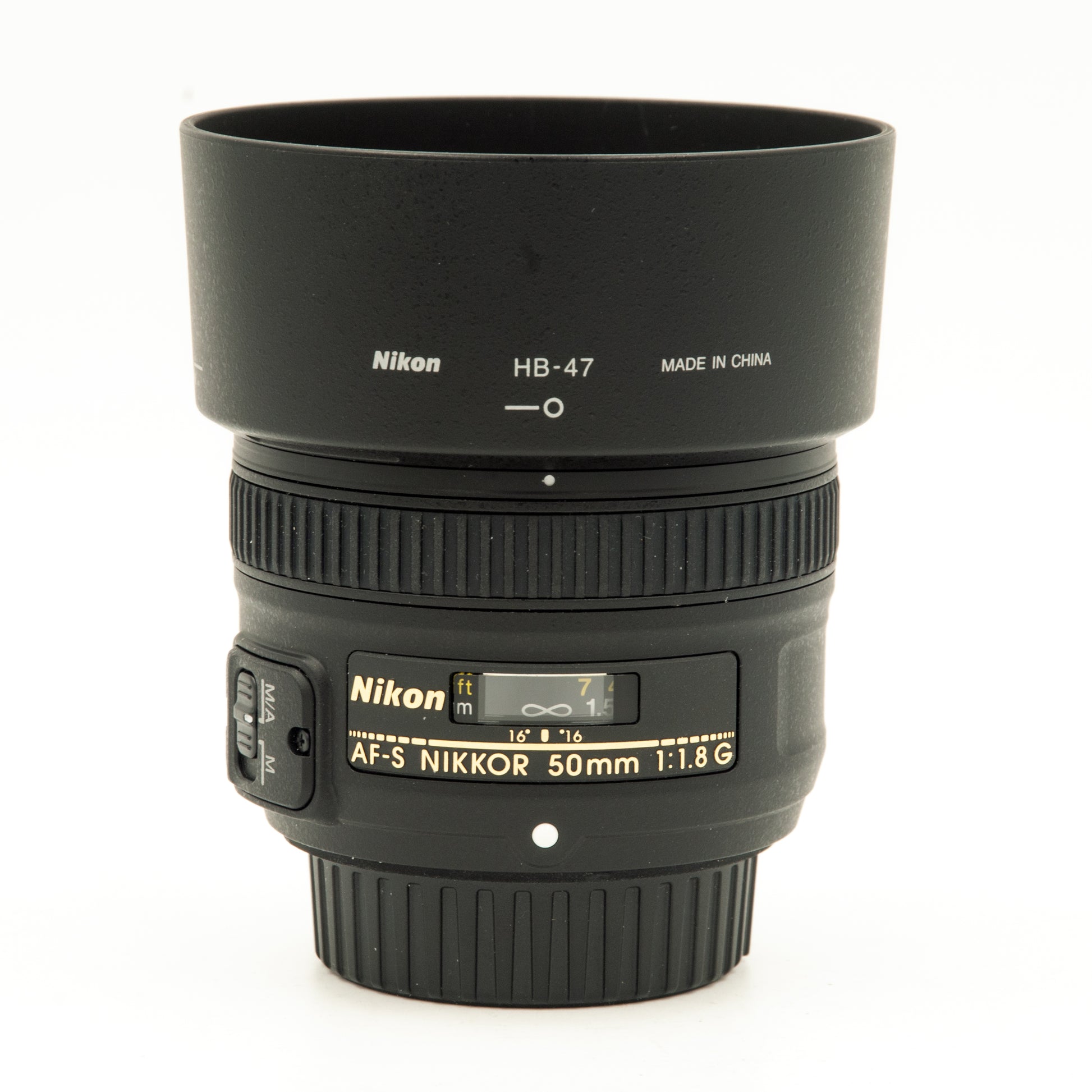 Includes Nikkor 50mm f1.8 lens, front and rear lens caps, and lens hood.